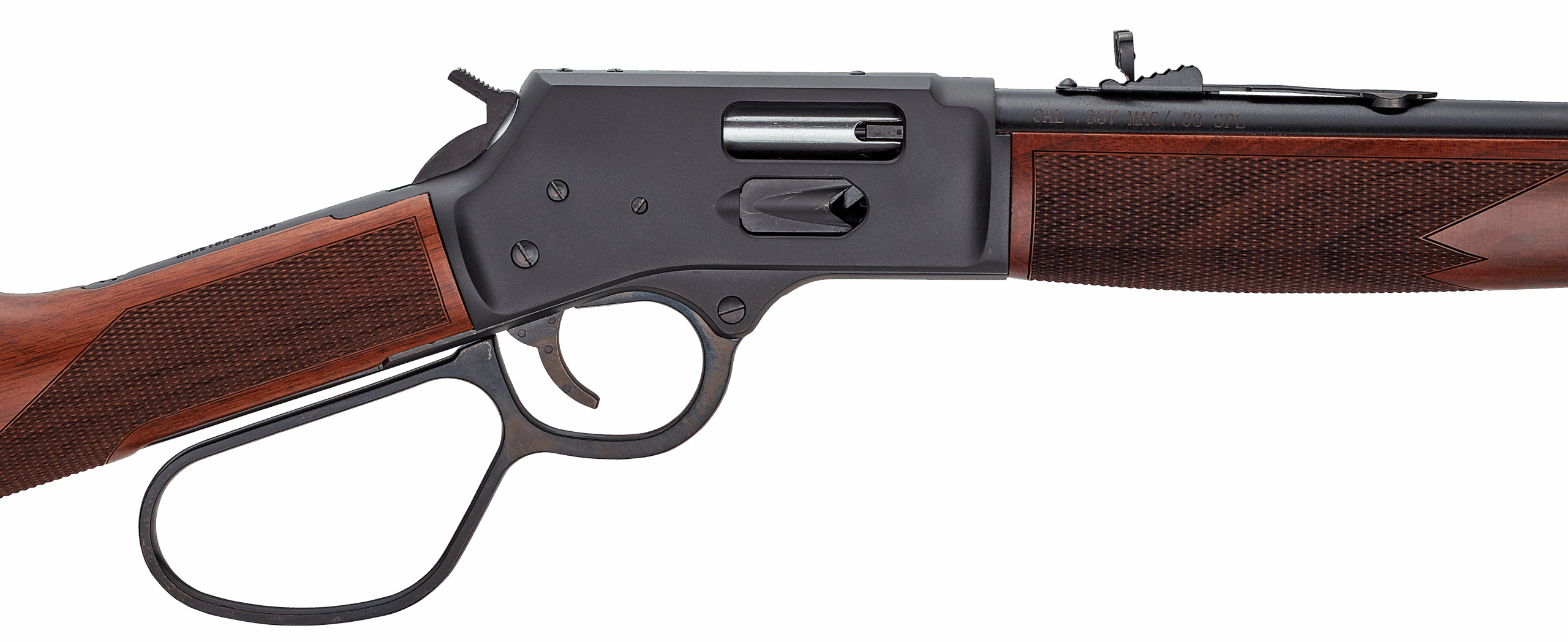 Henry’s Big Boy Steel Carbine was designed with the modern hunter in mind. Built in line with all Henry lever actions, you can count on a smooth, quiet and reliable action. It features a round barrel that delivers accuracy and is topped with a fully adjustable rear sight with white diamond insert and a beaded front sight. The receiver is matte finish and comes drilled and tapped for easy scope mounting using Henry’s BB-RSM receiver scope mount. The checkered all-weather American walnut stock comes with a sturdy and impact resistant recoil pad.