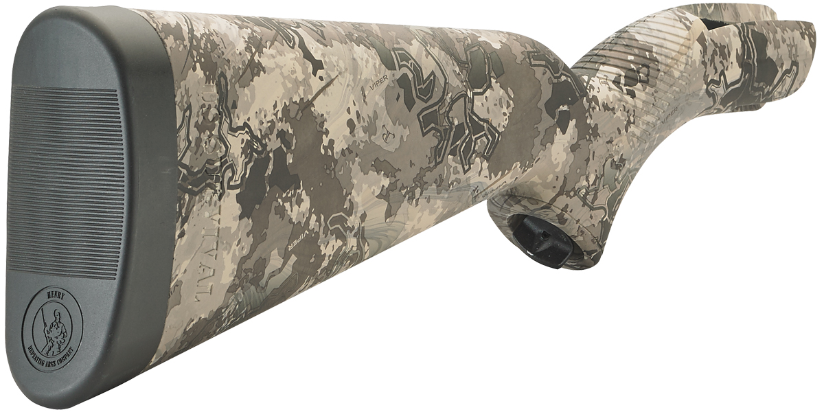 Henry’s U.S. Survival rifle is lightweight at 3.5 pounds and highly portable. The unique design allows the rifle to break down easily into three pieces in seconds. This enables the barrel, action, and two 8-round magazines to fit comfortably into the tough ABS synthetic waterproof stock. No tools are needed to assemble or disassemble. Once disassembled and stowed, it is only an incredible 16.5″ long. It comes standard with a sturdy steel barrel covered in tough ABS plastic with a protective coating for complete corrosion resistance. The receiver is grooved, making it easy to top off with your favorite optic. This model features an all over Viper Western camo finish.