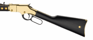 Never seen on a Henry rifle before it, the Texas Tribute Edition features a deep black stain on all the walnut furniture, which provides a stark contrast to the gold and brass highlights throughout the rest of the rifle. The wood is then studded on both sides with inlaid metal 5-pointed stars that perfectly match the “Lone Star Flag” motif that is found on the buttstock surrounded by the Texas state outline. The left side of the buttstock is a bit more subdued with a lone star inlaid towards the buttplate.
