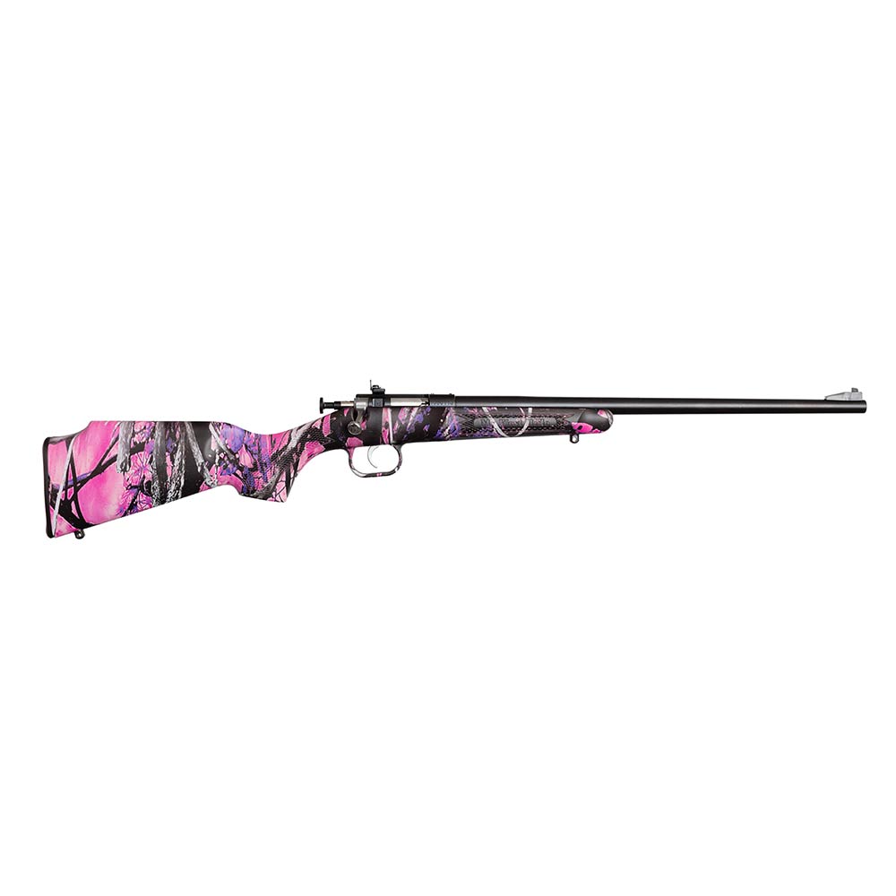 Crickett’s Crickett Synthetic Rifle has a manual cocking single-shot bolt action. It features a rebounding firing pin safety, adjustable rear peep sight and a fixed front, synthetic stock, and a drilled and tapped receiver. This model has a blued barrel and a pink camo stock.